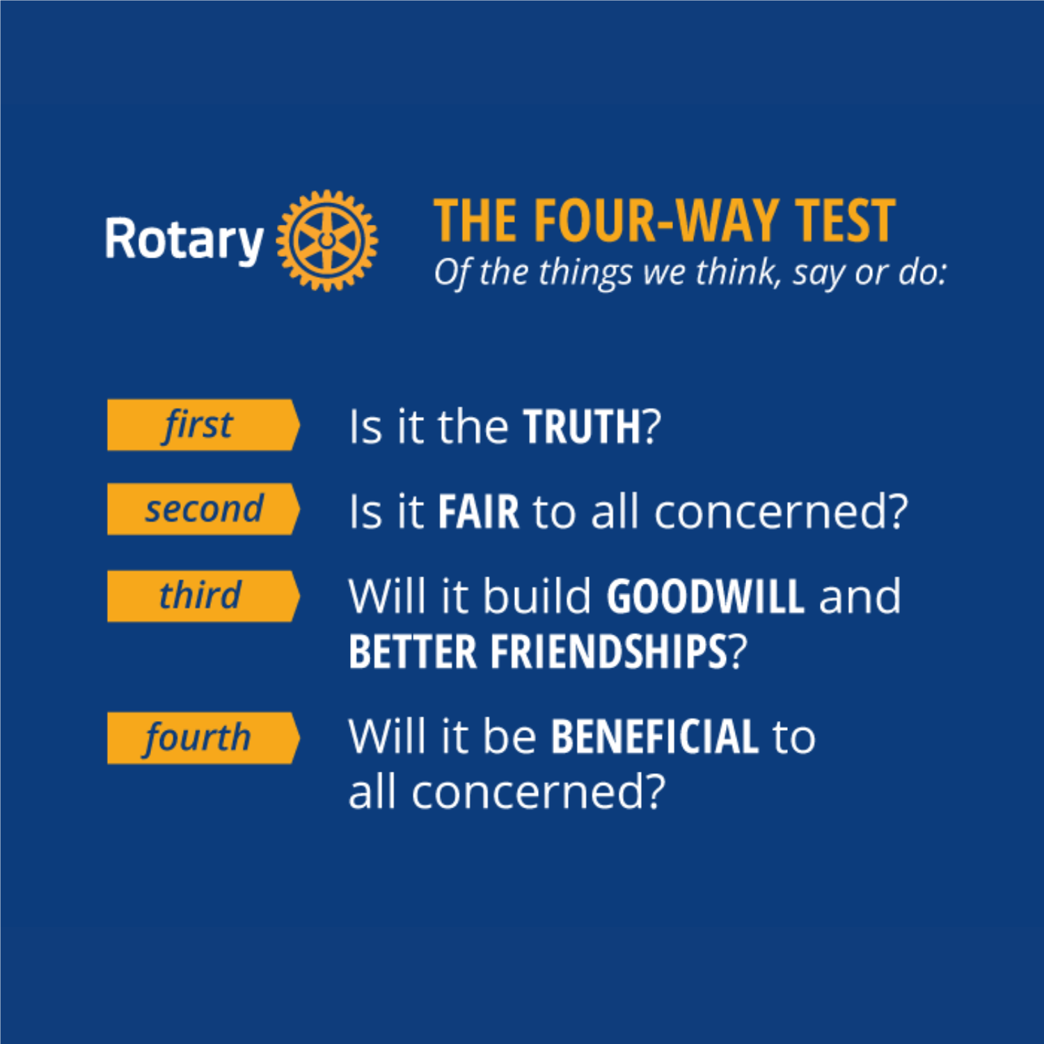 The Four-Way Test is a nonpartisan and nonsectarian ethical guide for Rotarians to use for their personal and professional relationships. The test has been translated into more than 100 languages, and Rotarians recite it at club meetings: