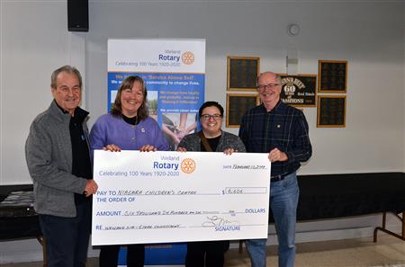 At the Rotary Club of Welland’s 6th Annual Curling Social, held at the Welland Curling Club on February 13, 2024, President Tammy Morden, along with Community Service Chair Peter Inman and Past President Vic Kerschl, presented a cheque to Marla Smith, Director of Development for the Niagara Children’s Centre.